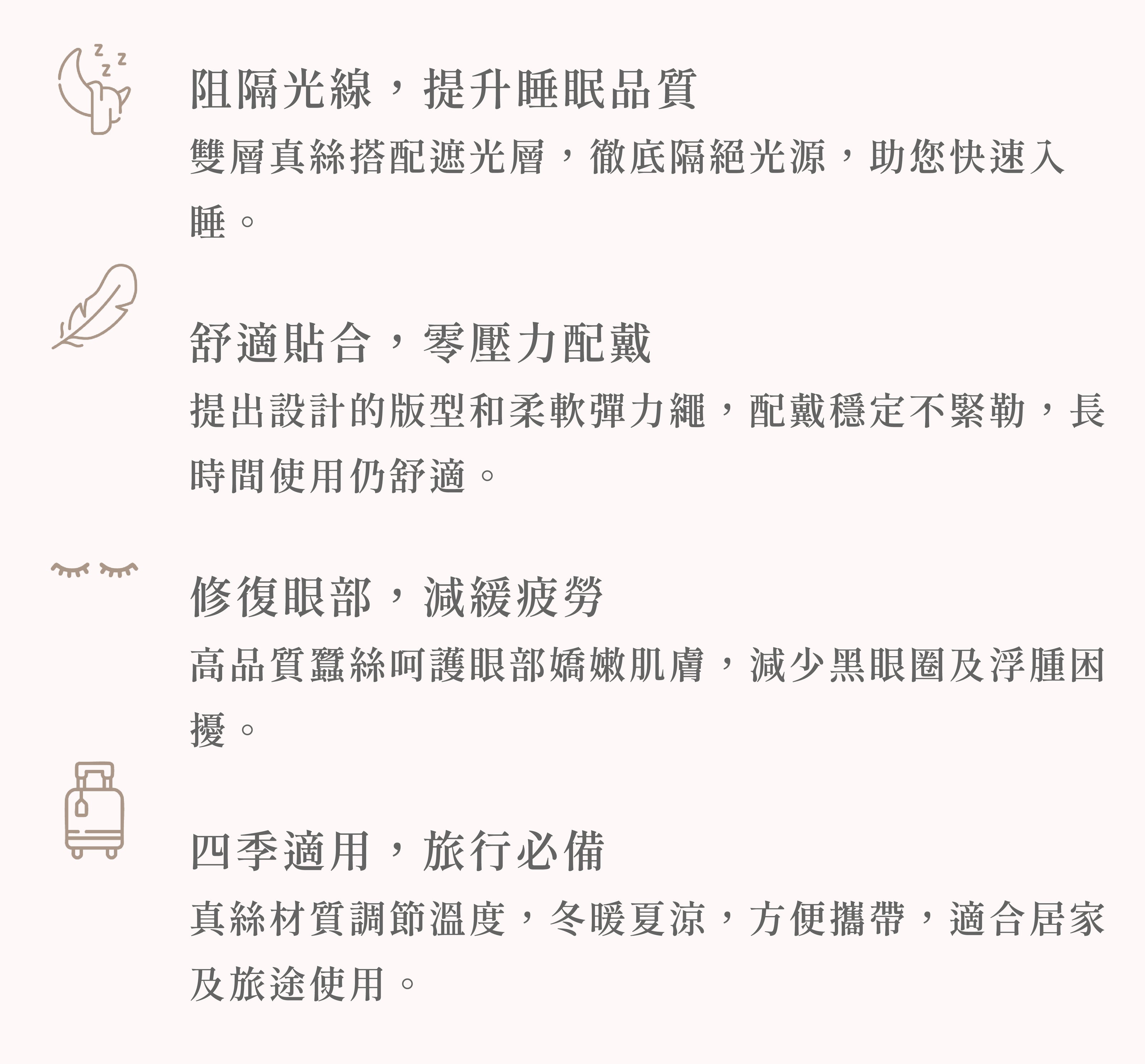 雙層真絲與遮光層設計,有助於提升褪黑激素分泌,幫助快速進入深層睡眠,同時舒緩眼部疲勞,減輕黑眼圈及浮腫問題。
