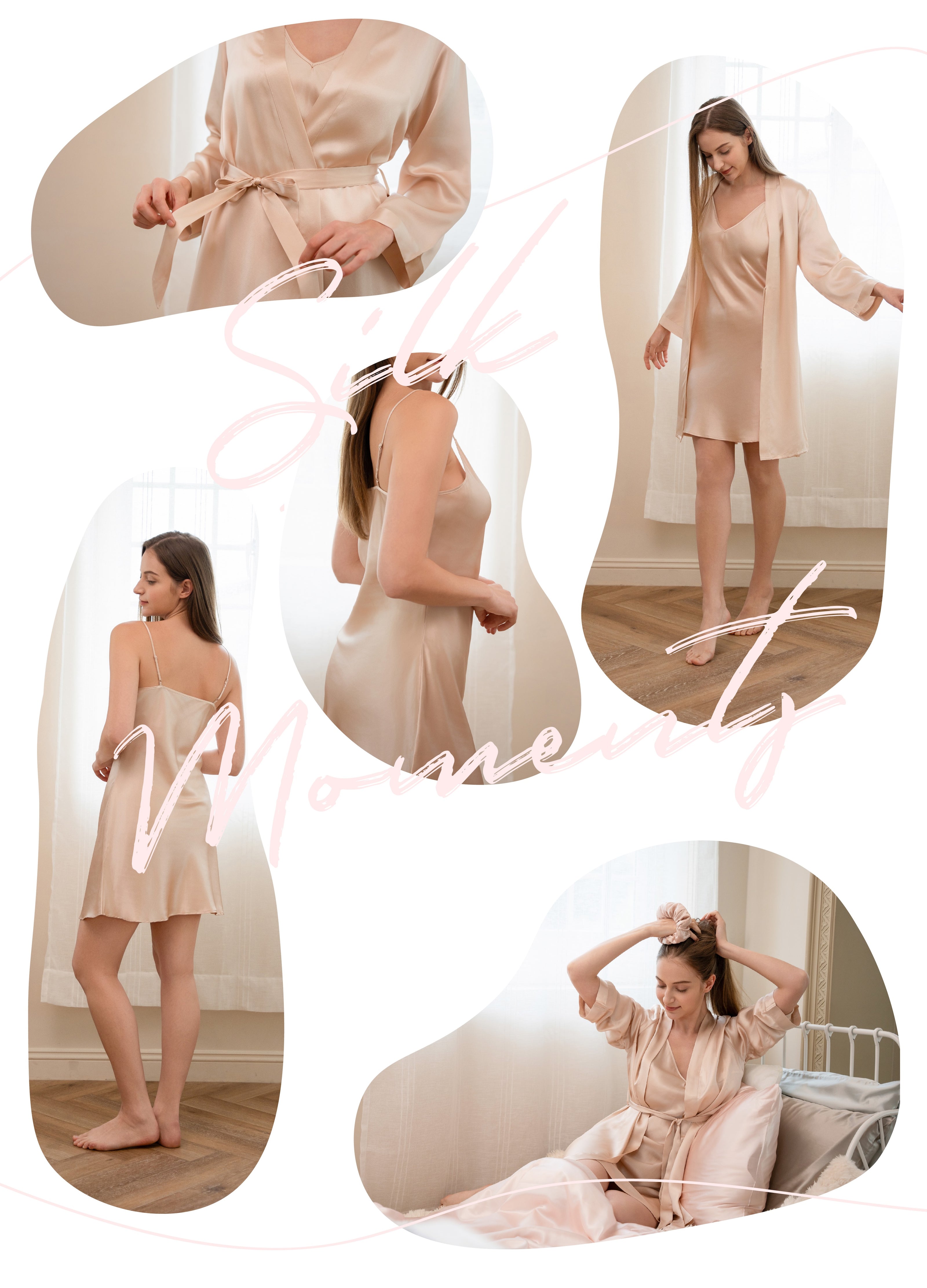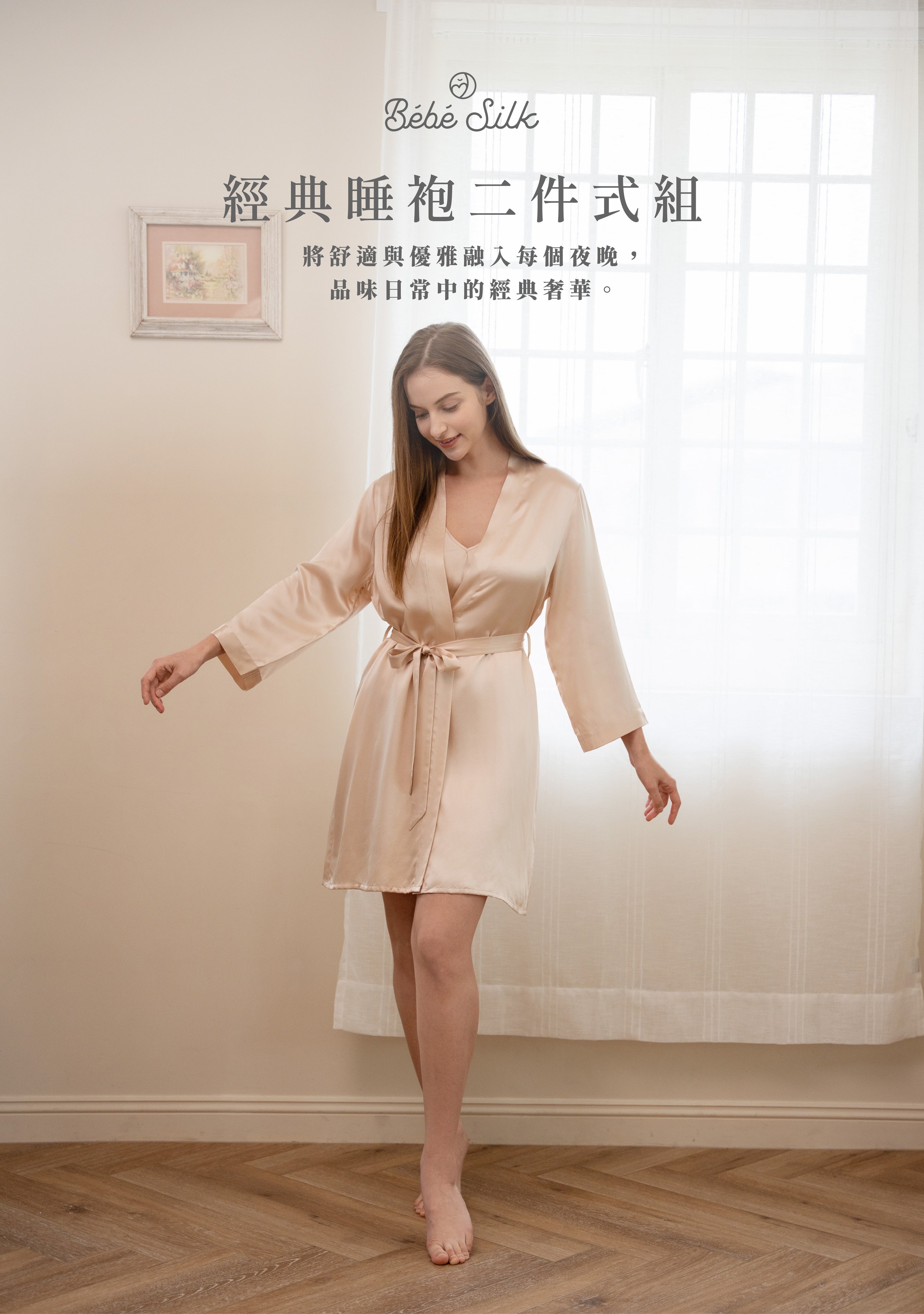 優雅與舒適,恣意詮釋居家之美這款睡袍與吊帶背心套裝,以真絲的柔滑質感與經典設計,將高級感融入日常。