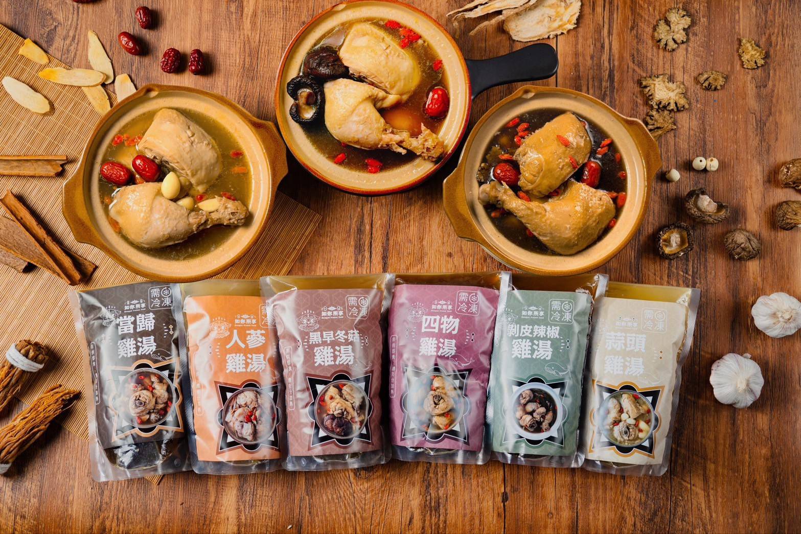四物雞湯/黑早冬菇雞湯/人蔘雞湯/蒜頭雞湯/當歸雞湯/剥皮辣椒雞湯