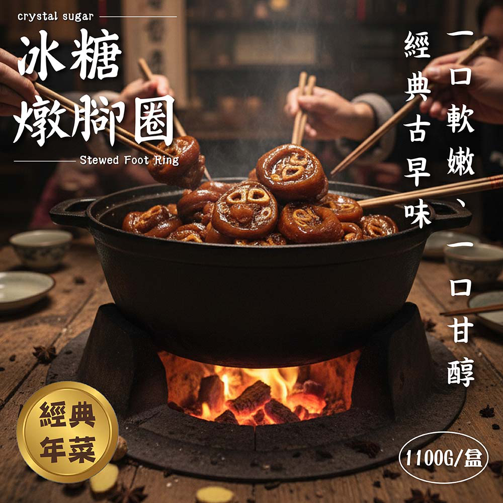 成分-豬腳,水,醬油,糖,乙醯化己二酸二澱粉,鹽,冰糖,蔥,味精,香油,芝麻油,大豆油),米酒,鉅利調合液[糖,水,焦糖色素,鹽,脫脂大片豆(非基因改造),小麥],豬肉精膏(香料,中鏈三酸甘油脂,丙二醇,麥芽糊精,鹽,D-木糖),蒜,小茴香,肉桂,桂枝,八角,花椒,陳皮,丁香,三奈,甘草,川芎,五加皮,當歸,芥花油,蔭瓜{越瓜,糖(糖,果糖)黑豆醬油,水,鹽(鹽,氯化鉀),鮮味香菇汁(味精,香菇原汁,昆布原汁,檸檬酸,5”-次黃呤核苷磷酸二鈉,5”-鳥嘌呤核苷磷酸二鈉),甜味劑[複方甘草酸鈉(麥芽糊精,檸檬酸鈉,甘草酸鈉) ]}